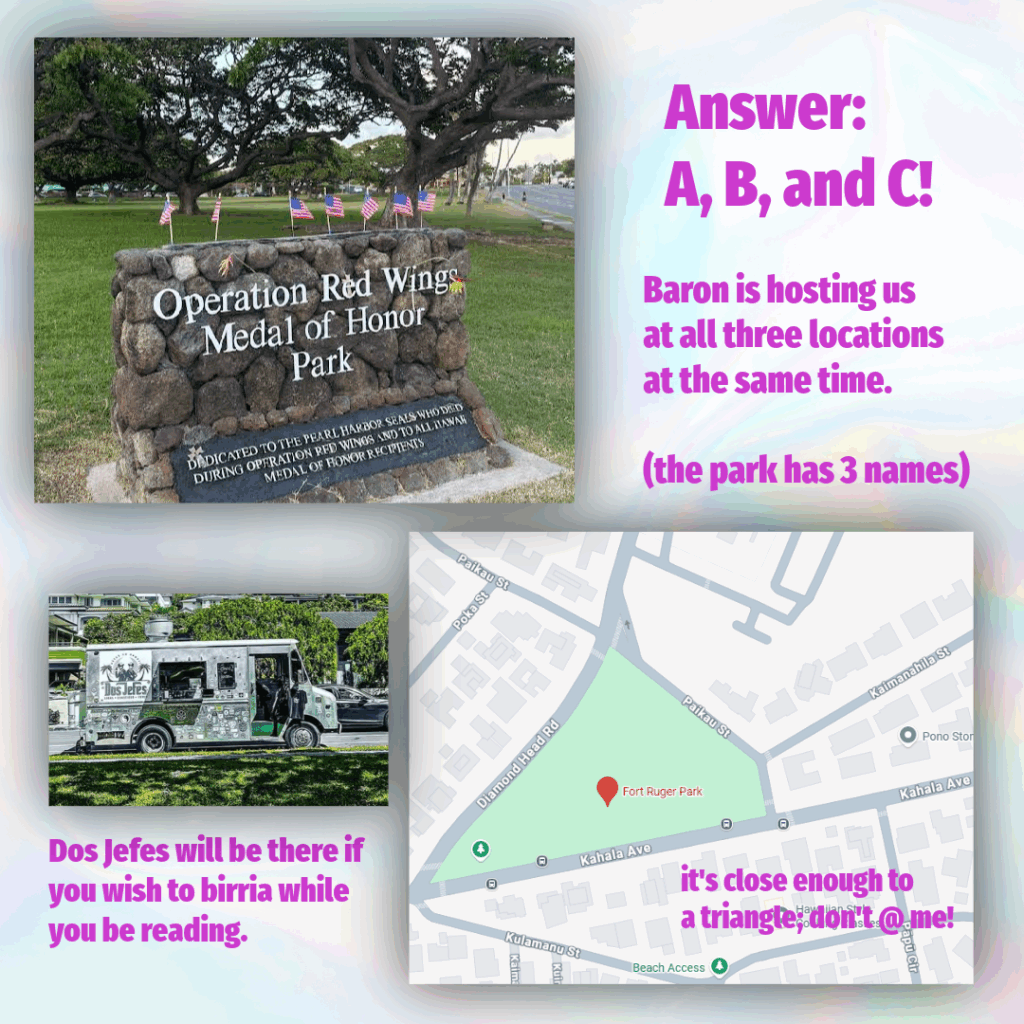 We’ll meet him beneath t he trees near the intersection of Paikau St. and Kaimanahila St. (see map on picture 2). He’ll have a blue picnic blanket spread out.